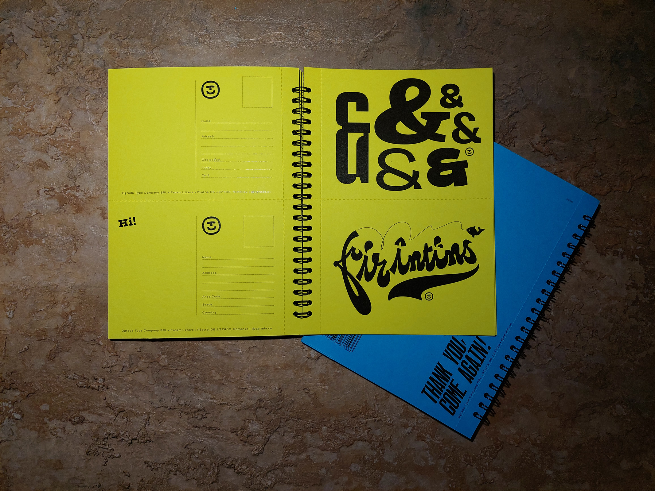 Broșură specimen de litere ce prezintă fonturile OTC Eugen, OTC Ecaterina, OTC Mara, OTC Fat Cats, OTC Laszlo, OTC Escu, OTC Hitomi34, OTC Riga, OTC Monoblocks, OTC Pebbles, OTC Meridian Zero, și OTC Oituz împreună cu familiile de caractere disponibile aferente, dezvoltate de Andrei Ogradă.